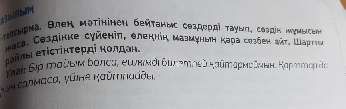 5-тапсырма. Өлең мәтінінен бейтаныс сөздерді тауып, сөздік жұмысын жаса. Сөздікке сүйеніп, өлеңнің мазмұнын қара сөзбен айт. Шартты райлы етістіктерді қолдан. Үлгі: Бір тойым болса, ешкімді билетпей қайтармаймын. Қарттар а бір ән салмаса, үйіне қайтпайды АЙТЫЛЫМ