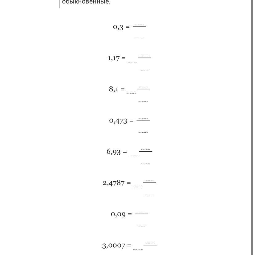 Ответ: 3/10, 1 17/100, 8 1/10, 473/1000, 6 93/100, 2 4787/10000, 9/100, 3 7/10000.
