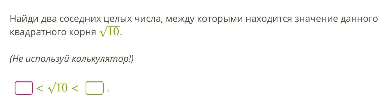 Найди два соседних целых числа, между которыми находится значение данного квадратного корня 10
