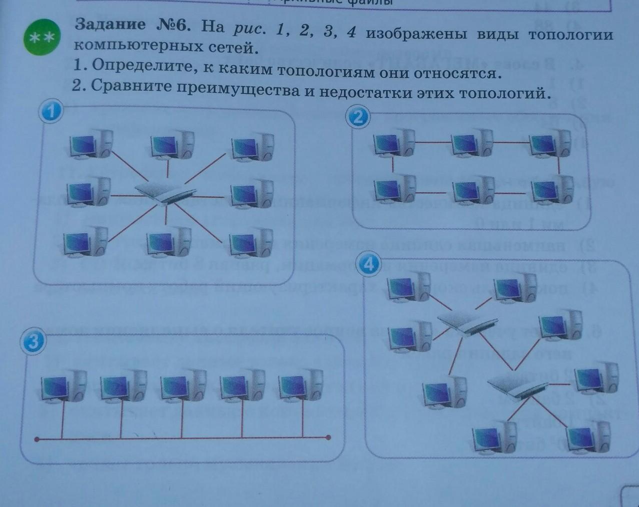 Задание №6. На рис. 1, 2, 3, 4 изображены виды топологии компьютерных сетей. 1. Определите, к каким топологиям они относятся. 2. Сравните преимущества и недостатки этих топологий.