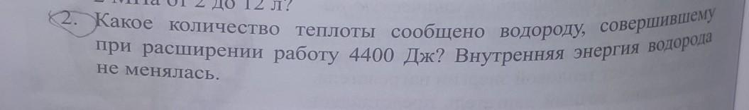 2. Какое количество теплоты сообщено водороду, совершившему при расширении работу 4400 Дж? Внутренняя энергия водорода Не менялась.