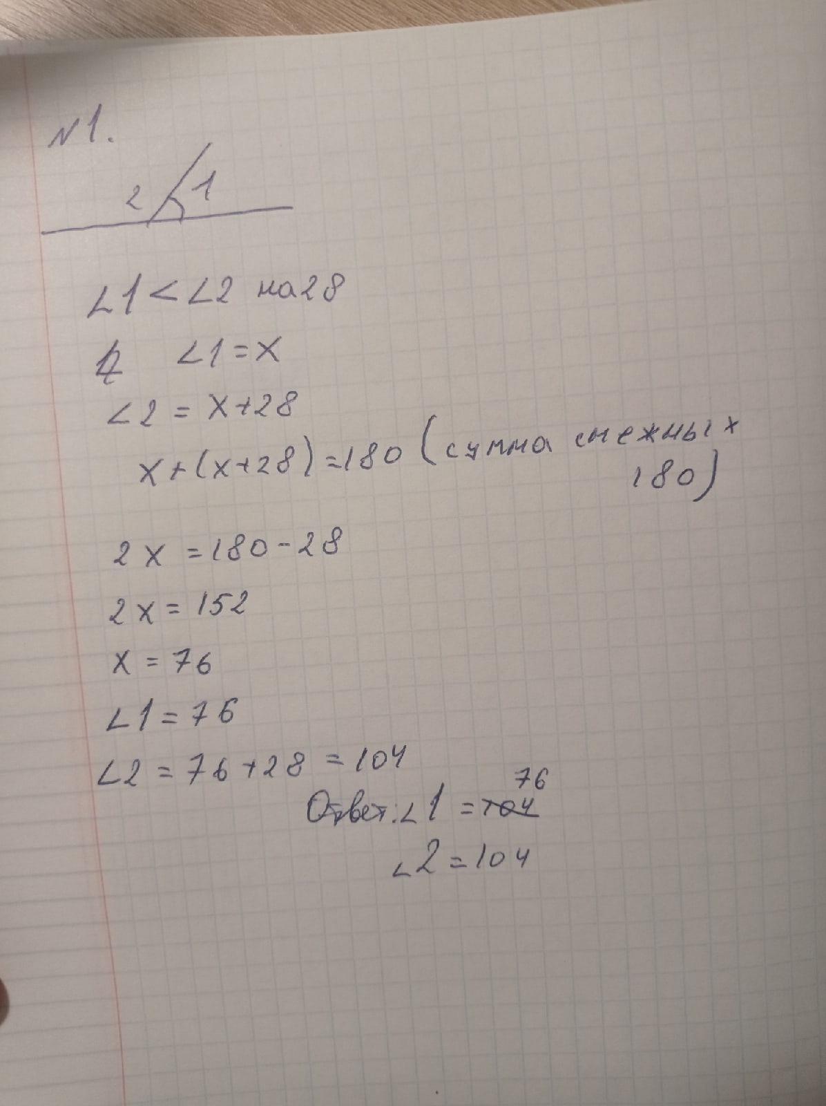 кут 1=76°, кут 2= 76°+28°=104°