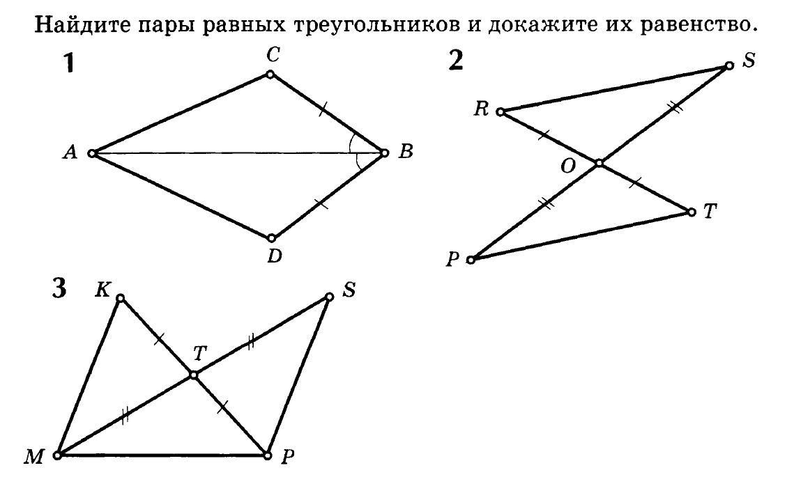 3) △KTM = △PTS согласно Теорема 1. Равенство треугольников по двум сторонам и углу между ними.
