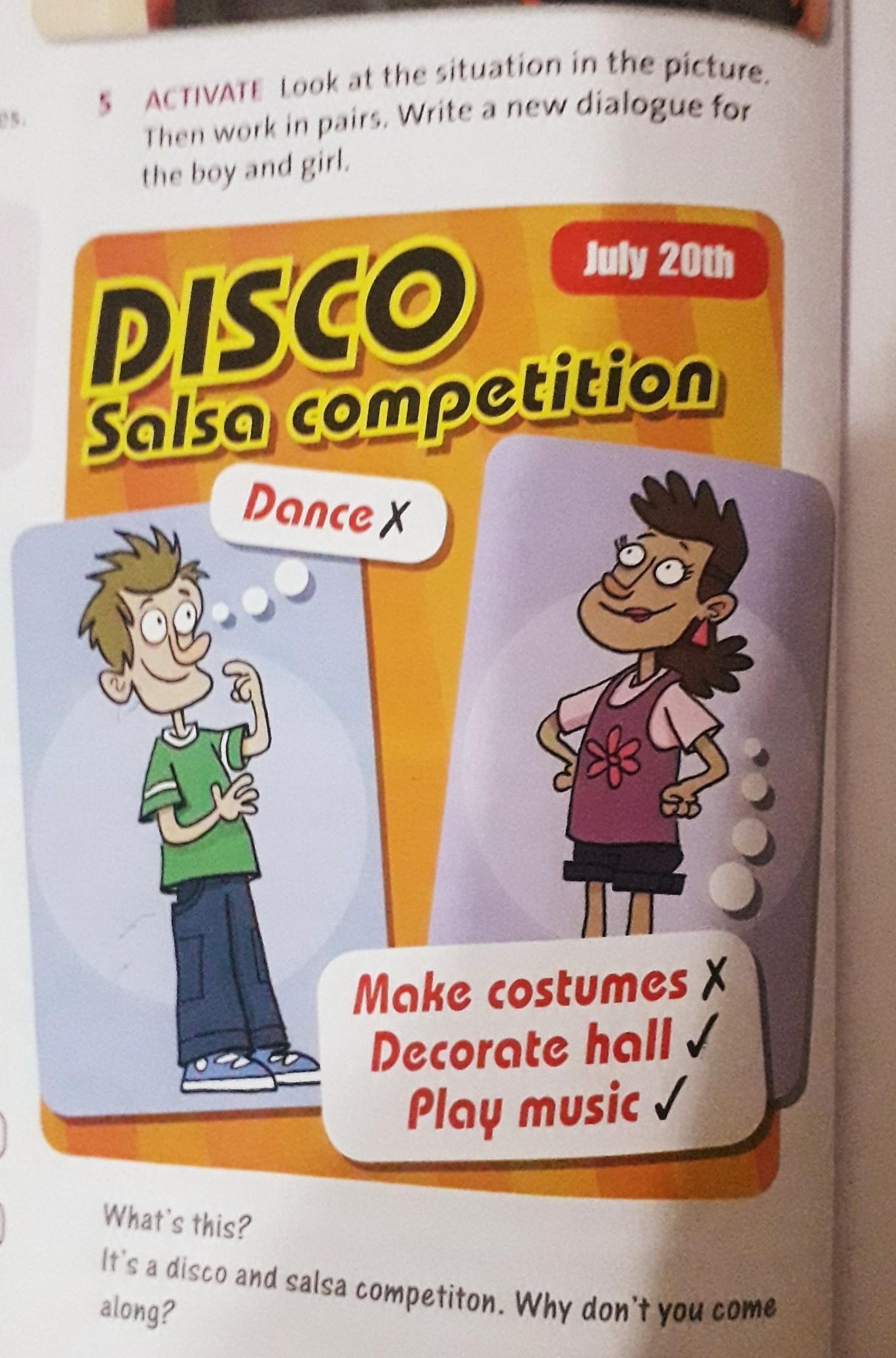 look at the situation in the picture. Then work in pairs. Write a new dialogue for the boy and girl