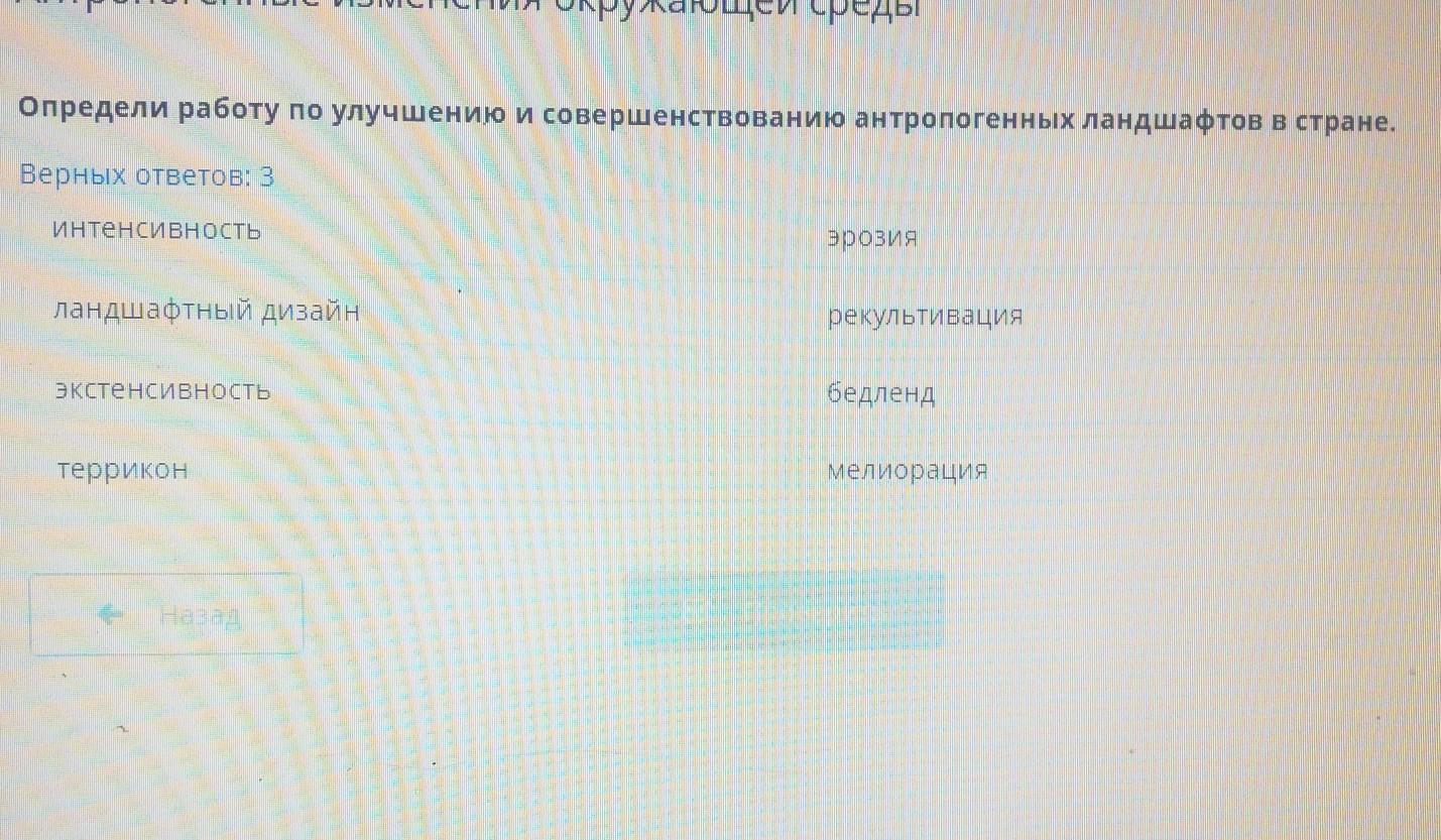 Определи работу по улучшению и совершенствованию антропогенных ландшафтов в стране.