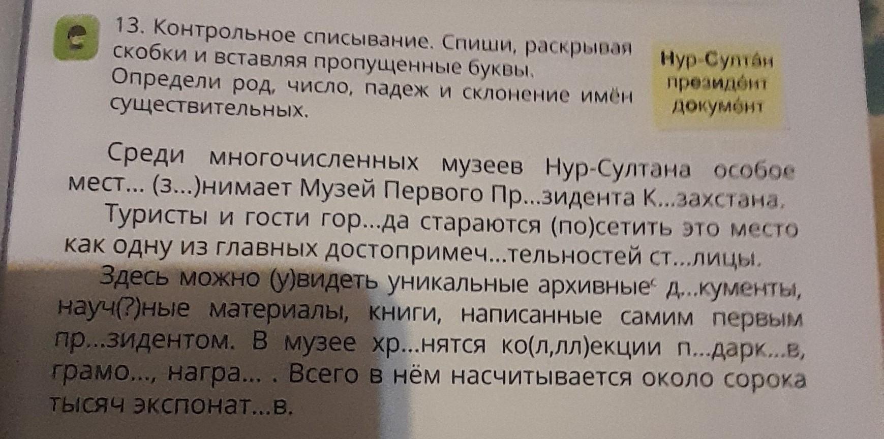 Среди многочисленных музеев Нур-Султана особое мест... (3...)нимает Музей Первого Пр...зидента К...захстана. Туристы и гости гор...да стараются (посетить это место как одну из главных достопримеч...тельностей ст.лицы. Здесь можно увидеть уникальные архивные д...кументы, науч(?)ные материалы, книги, написанные самим первым пр...зидентом. В музее хр...нятся ко(л,ллекции п...дарк...в, грамо..., награ.... Всего в нём насчитывается около сорока Тысяч экспонат...в.