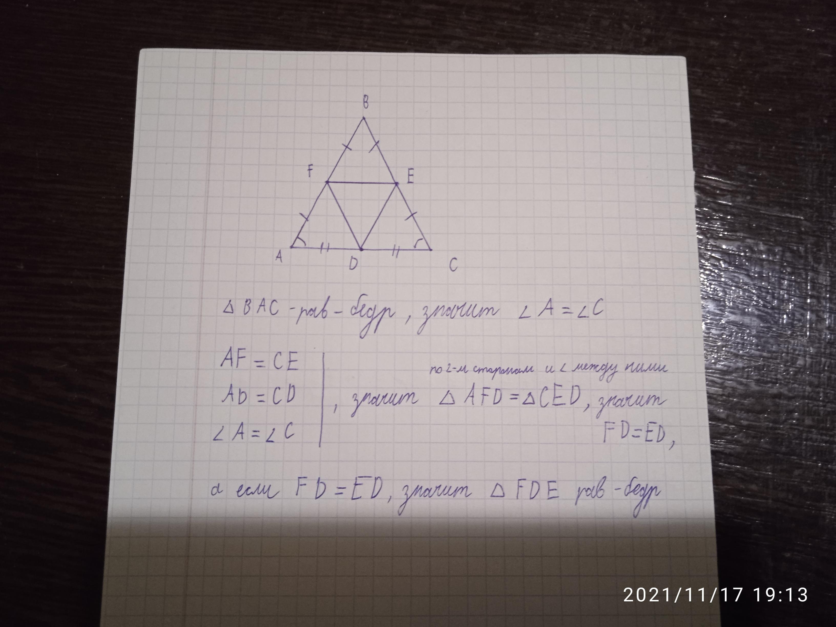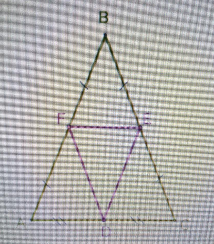 В равнобедренном треугольнике ABC соединены серединные точки сторон. Докажи, что полученный треугольник FDE тоже является равнобедренным.