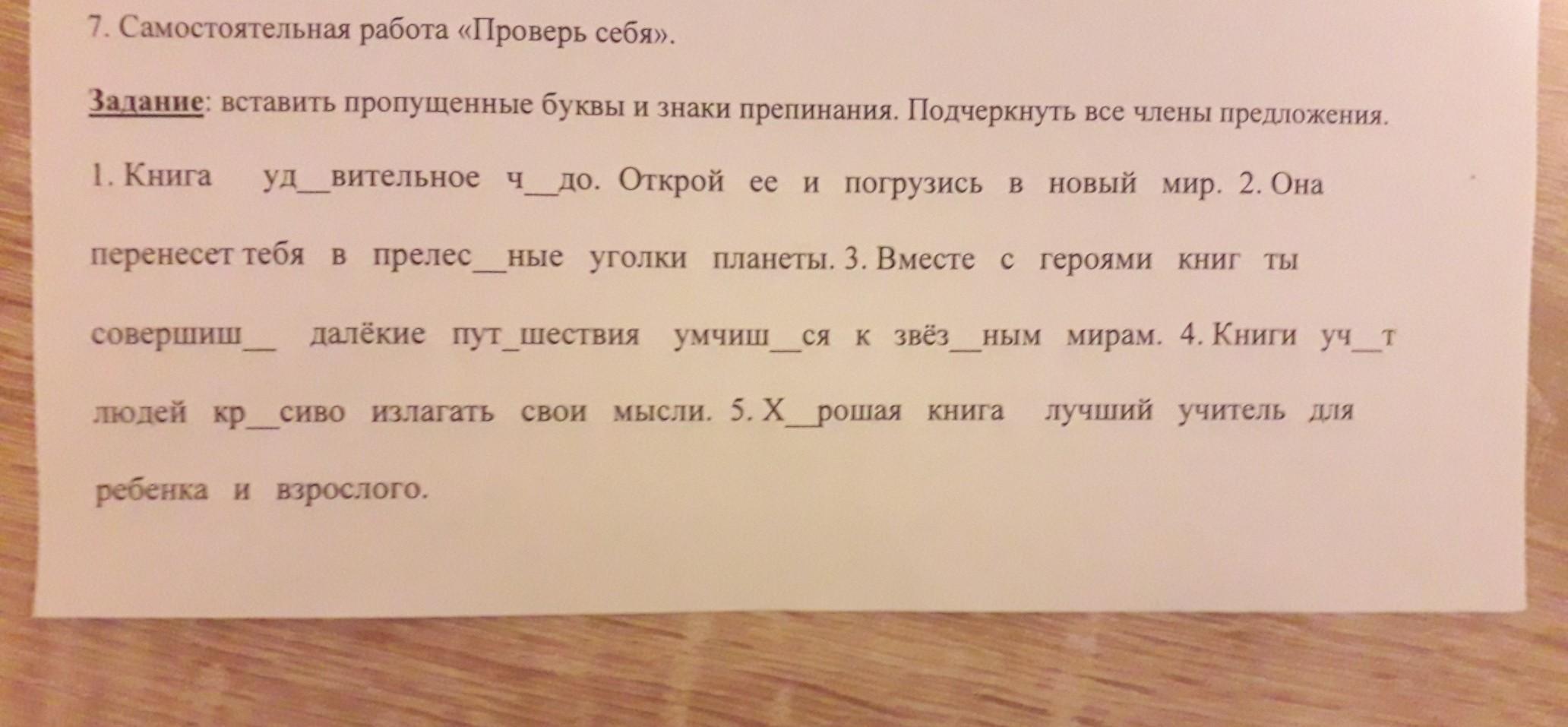 1. Книга уд_вительное учдо. Открой ее и погрузись в новый мир. 2. Она перенесет тебя в прелес_ные уголки планеты. 3. Вместе с героями книг ты совершиш_ далёкие пут_шествия умчиш_ся к звёз_ным мирам. 4. Книги уч_т людей кр_сиво излагать свои мысли. 5. Х_рошая книга лучший учитель для ребенка и взрослого.