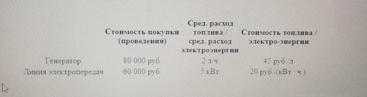 Хозяин участка планирует провести на участок электричество. Он рассматривает два варианта: купить генератор или продлить до своего дома линию электропередач. Данные о расходе топлива (электроэнергии) и стоимости ценах указаны в таблице.