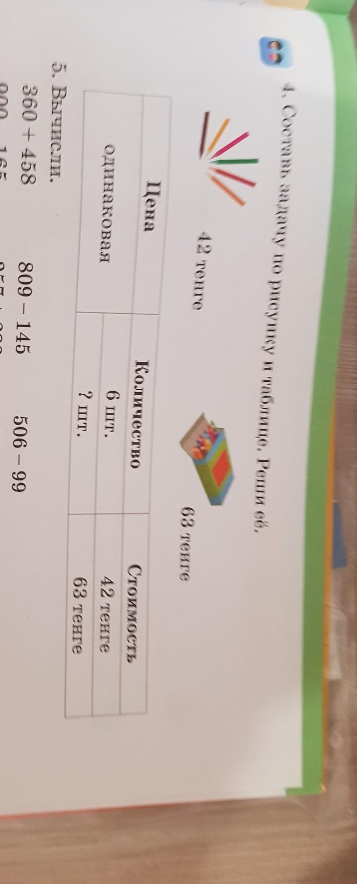 4. Составь задачу по рисунку и таблице. Реши её. 42 тенге 63 тенге Цена Количество Стоимость 42 тенге одинаковая 6 шт. ? шт. 63 тенге 5. Вычисли. Помагите пж я дам 10 баллов