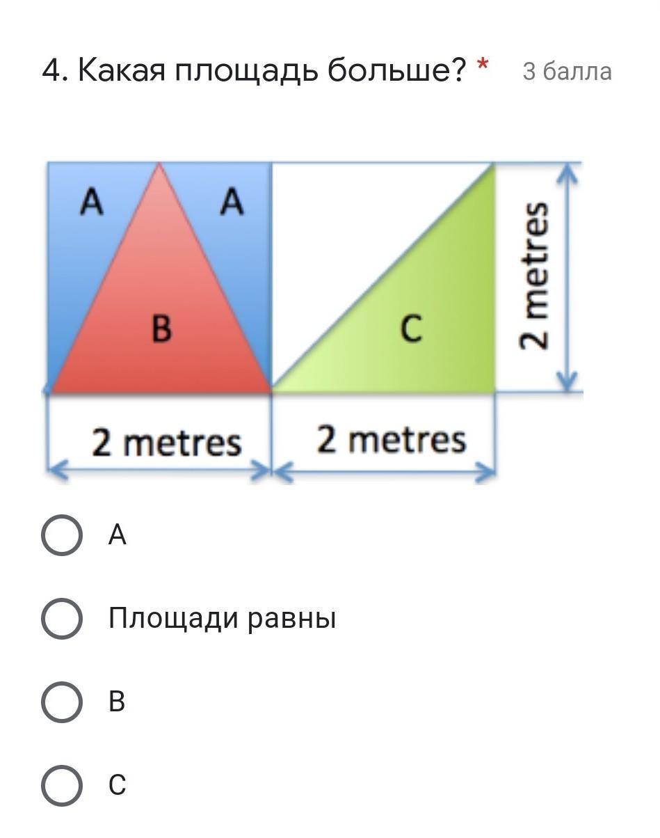 Какая площадь больше? * 3 балла Подпись отсутствует A Площади равны B C пожалуйста помогите дам 15баллов