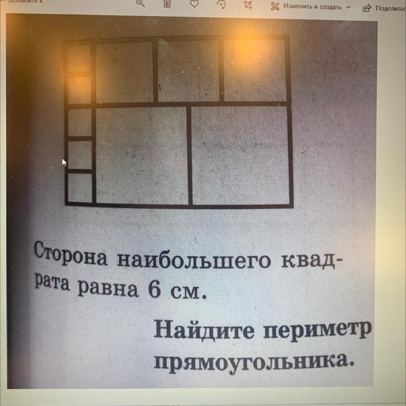 Сторона большого квадрата-бсм. Это квадрат, значит все его стороны -бсм. Рядом находится такой же квадрат, т.е. все его стороны тоже бсм. Слева от большого квадрата - 3 маленьких квадрата, которые делят его сторону на 3 части, следовательно сторона маленького квадрата 6/332см. Длина общего прямоугольника 6+6+2-14см. Ширина общего прямоугольника 2*5-10см Периметр - сумма длин всех сторон P-14+14+10+10 P-48см