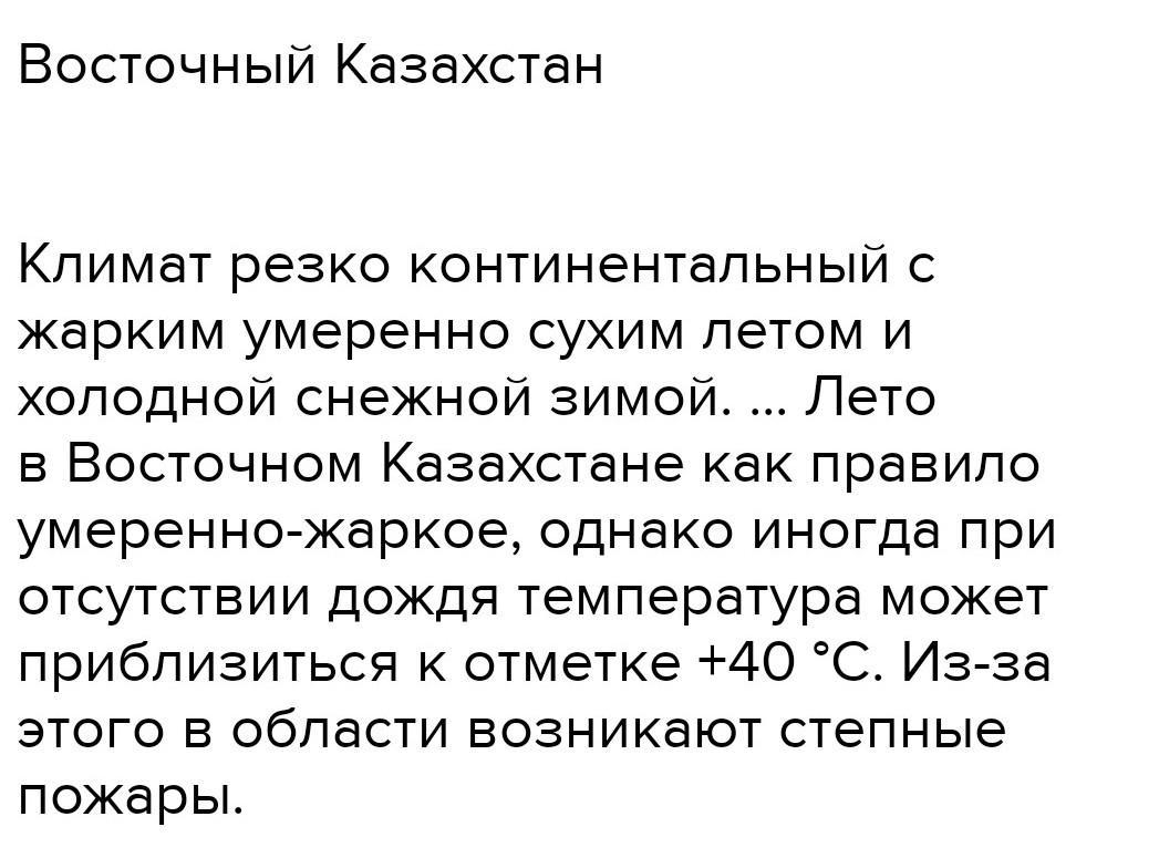 Климат резко континентальный с жарким умеренно сухим летом и холодной снежной зимой. ... Лето в Восточном Казахстане как правило умеренно-жаркое, однако иногда при отсутствии дождя температура может приблизиться к отметке +40 °С. Из-за этого в области возникают степные пожары.
