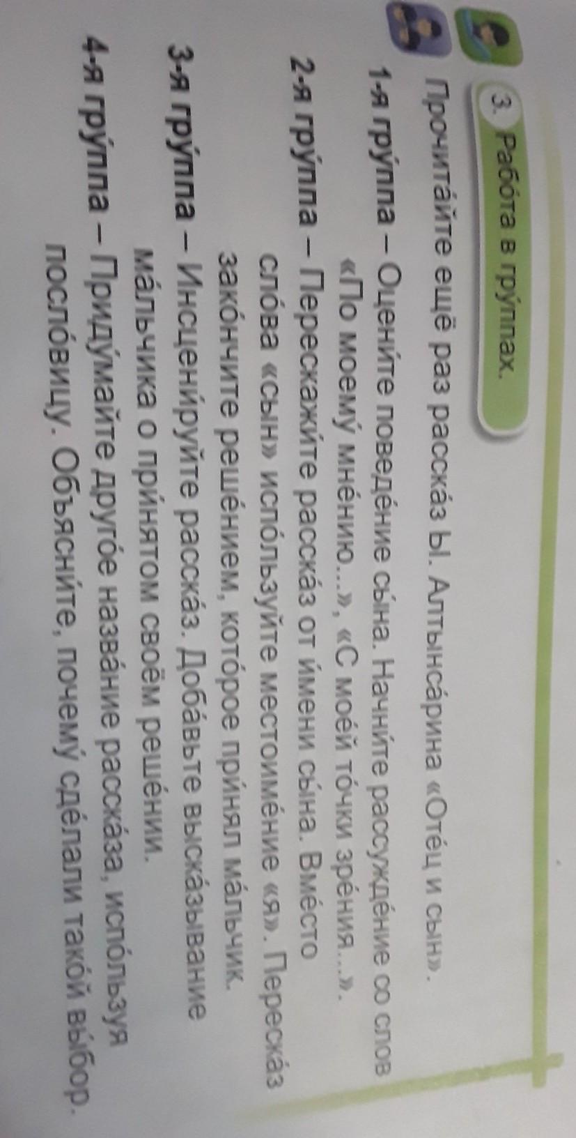 . Работа в группах. Прочитайте ещё раз рассказ Ы. Алтынсарина «Отец и сын». 1-я группа - Оцените поведение сына. Начните рассуждение со слов «По моему мнению...», «С моей точки зрения...». 2-я группа - Перескажите рассказ от имени сына. Вместо слова «сын» используйте местоимение «я». Пересказ закончите решением, которое принял мальчик. 3-я группа – Инсценируйте рассказ. Добавьте высказывание мальчика о принятом своём решении. 4-я группа - Придумайте другое название рассказа, используя пословицу. Объясните, почему сделали такой выбор. - пж помогите