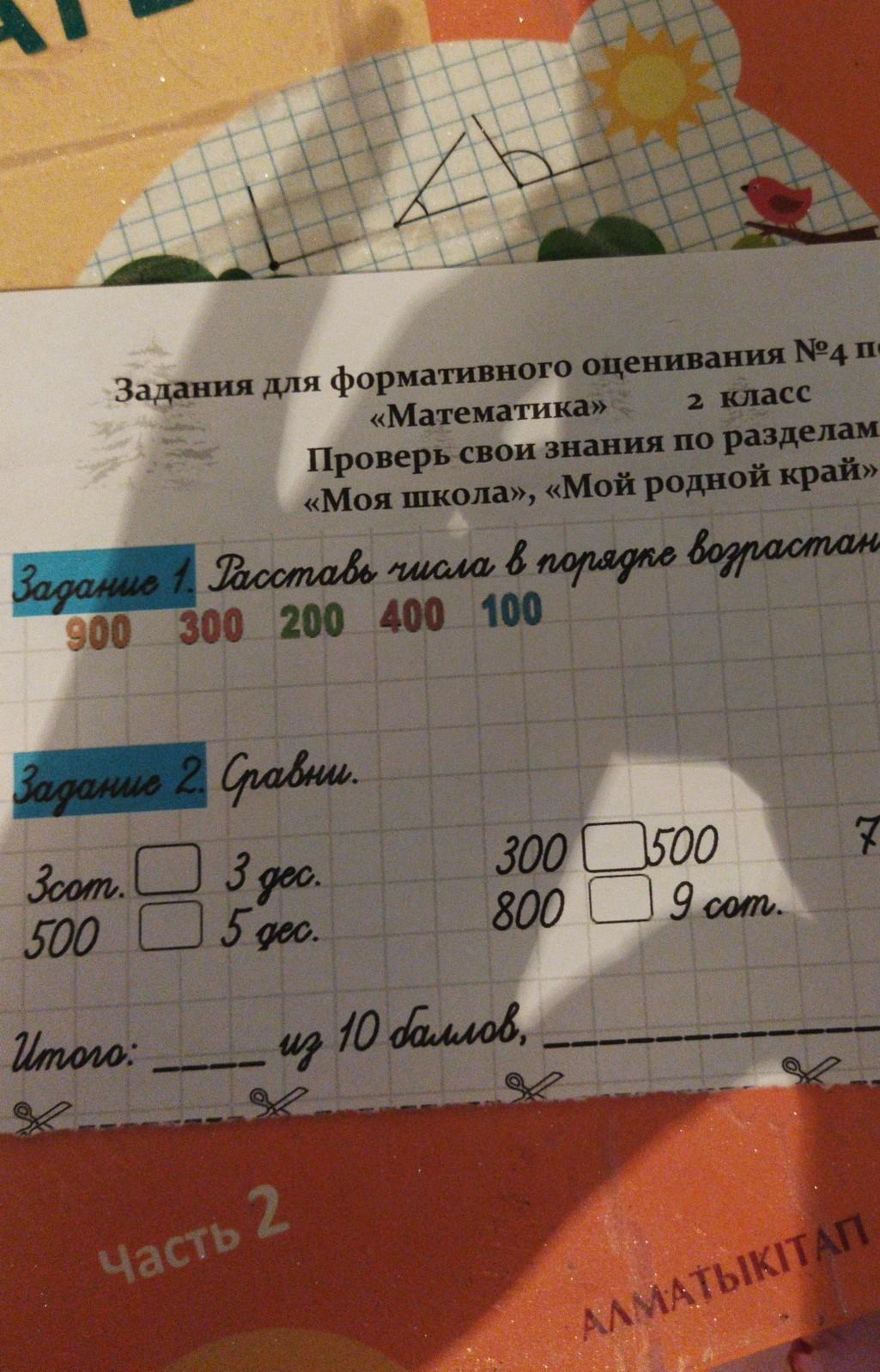 2 класс w Задания для формативного оценивания №4 по предмету «Математика» Проверь свои знания по разделам «Моя школа», «Мой родной край». Задание 1 асставь числа в порядке возрастания. 8 900 300 200 400 100 2. ученика Лист Задание 2 Сравни. 3com. 500 3 део. 0 7000 800 300 500 800 5 део. 9 com. 10 danol, уровень Umoro: ж —