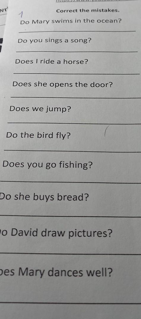 Correct the mistakes. 1 Do Mary swims in the ocean? Do you sings a song? Does I ride a horse? Does she opens the door? Does we jump? Do the bird fly? Does you go fishing?