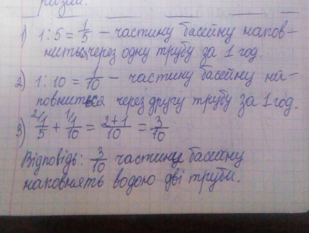 Через 1 трубу ноповняеться водою за 5 год , а через другу - за 10 год . Яку частину бассейну наповнять водою за 1 год 2 трубы працюючи разом?
