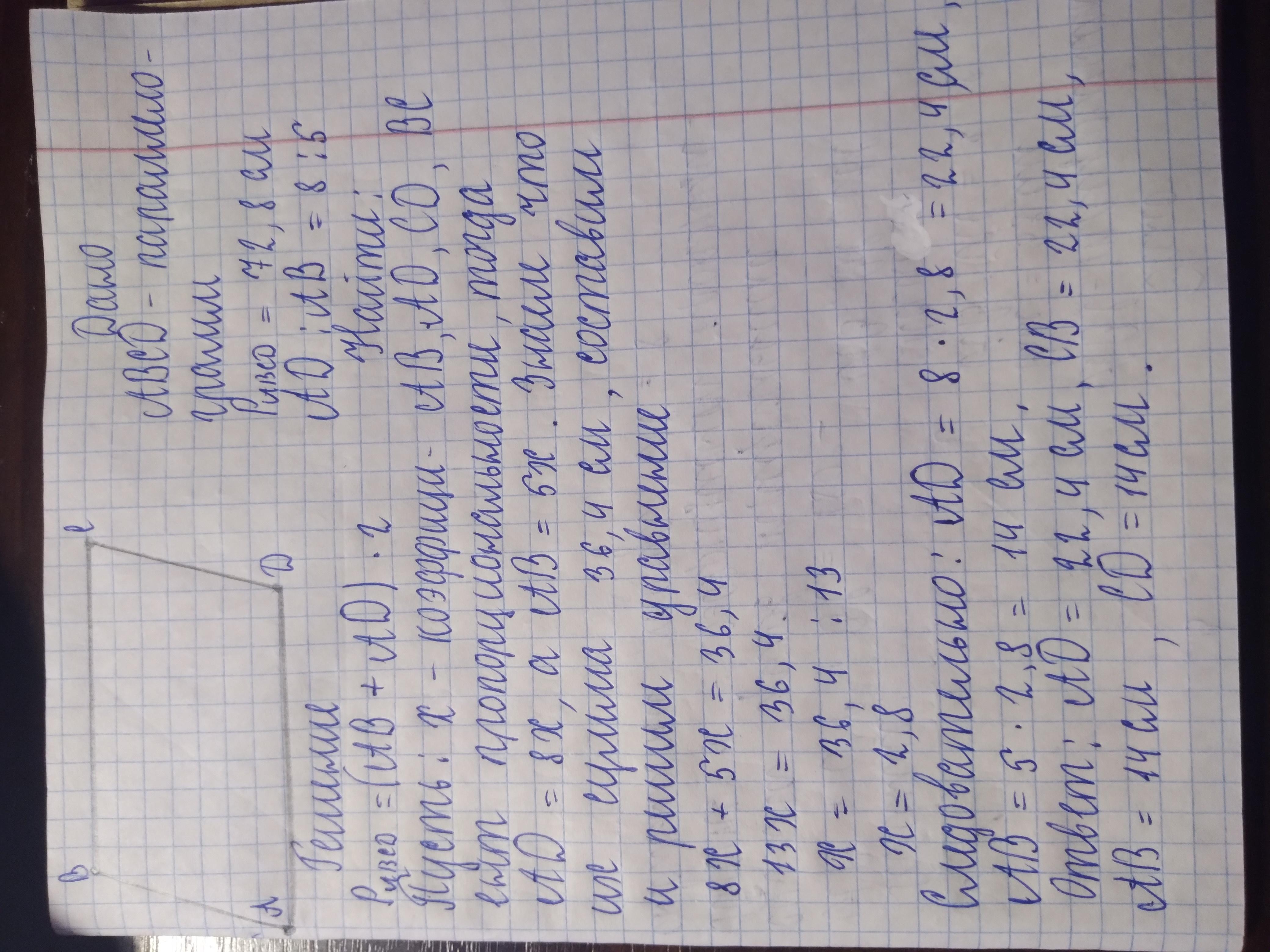 Стороны параллелограмма соотносятся как 8:5, а периметр равен 72,8 см. Вычисли стороны параллелограмма.