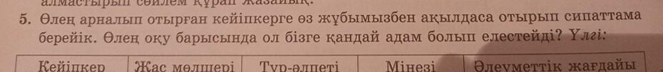 5. Өлең арналып отырған кейіпкерге өз жұбымызбен ақылдаса отырып сипаттама берейік. Өлең оқу барысында ол бізге қандай адам болып елестейді? Үлгі: Кейіпкер Жас мөлшері Түр-әлпеті Мінезі Әлеуметтік жағдайы
