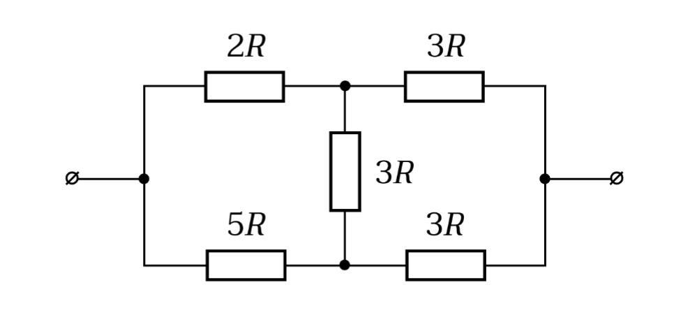 (Даю 50 баллов!!!) Определите сопротивление между выводами участка цепи, схема которого изображена на рисунке. Известно, что R=100 Ом. Найдите отношение токов, текущих через резисторы с сопротивлениями 2R и 5R, то есть I2RI5R. Ответ округлите до целого числа.