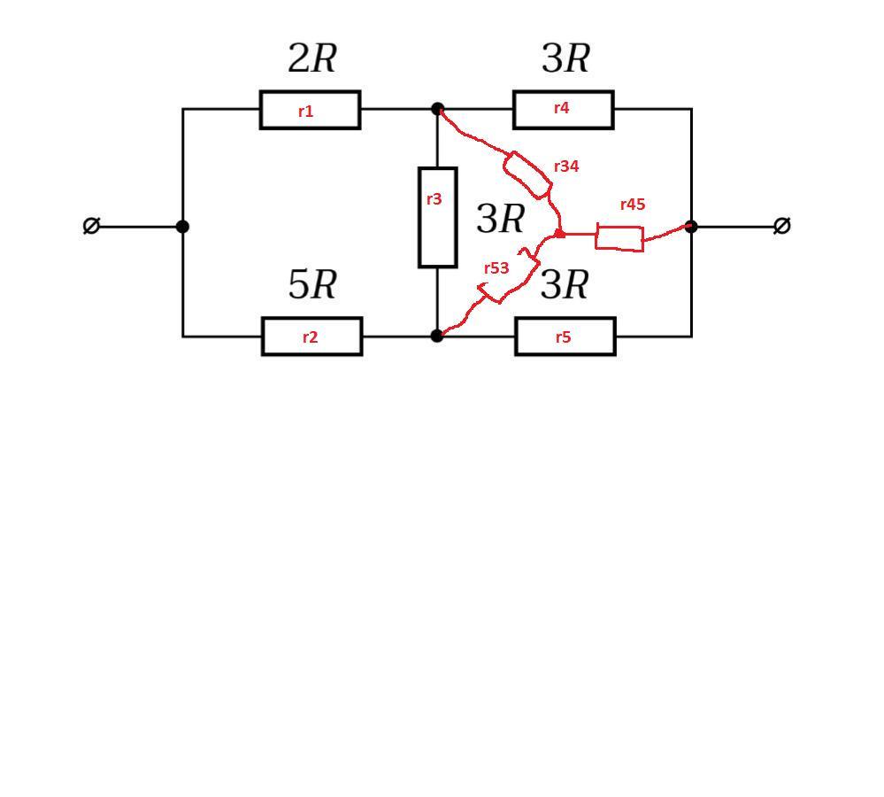 Преобразуем r3. r4. r5 в звезду (на рисунке красным)