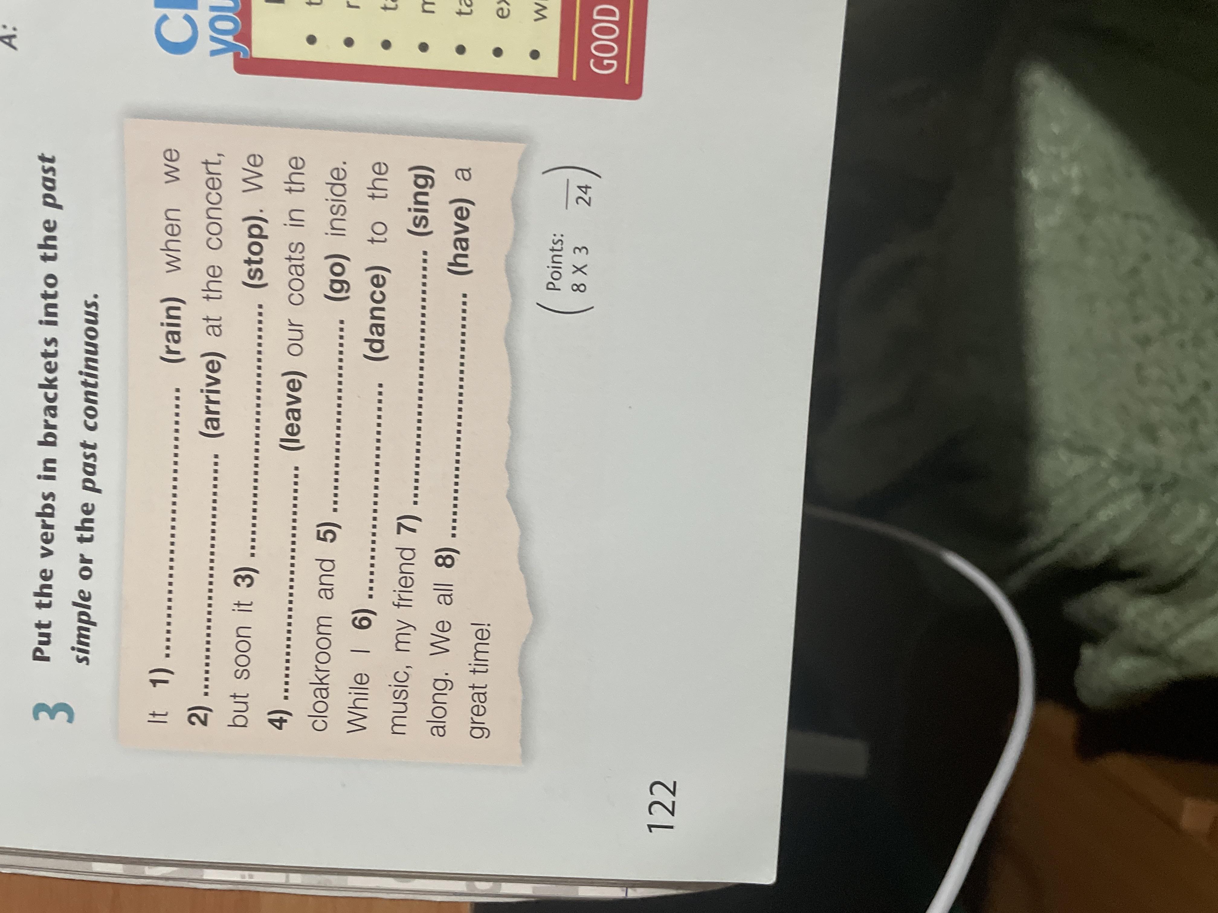 1.it was raining when we arrived at the concert.but soon it stopped.we left our coats in the cloakroom and went inside.while i was dancing to the music, my friend was singing along.we all had a great time.