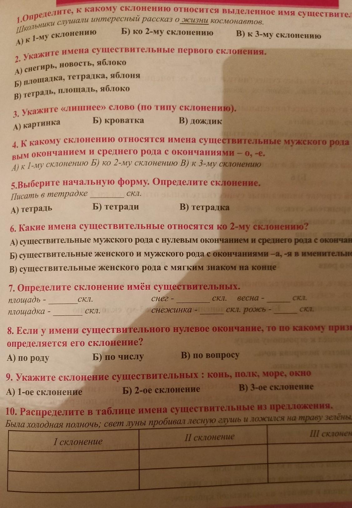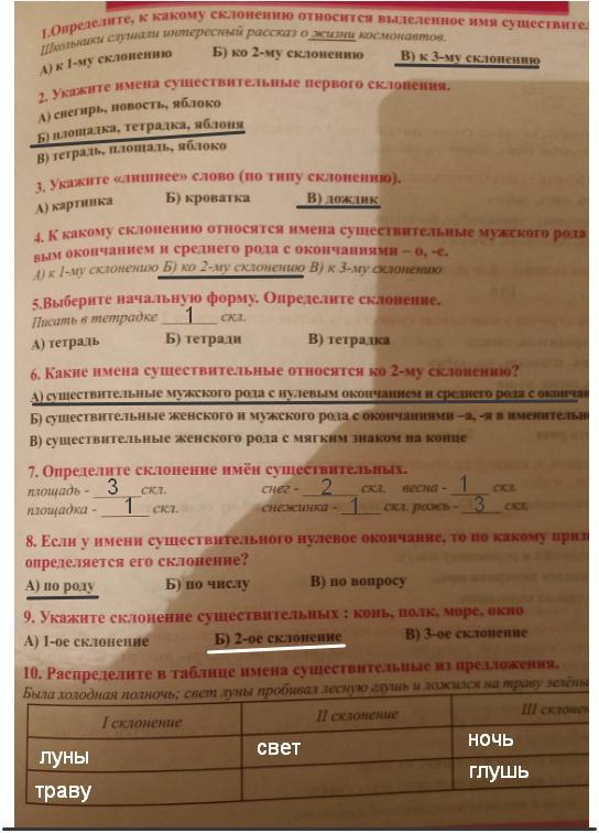 10. 1-ое склонение : Луны(луна), траву (трава). 2 - ое склонение : свет, и слово после зелёных. 3 - ие склонение : полночь, глушь