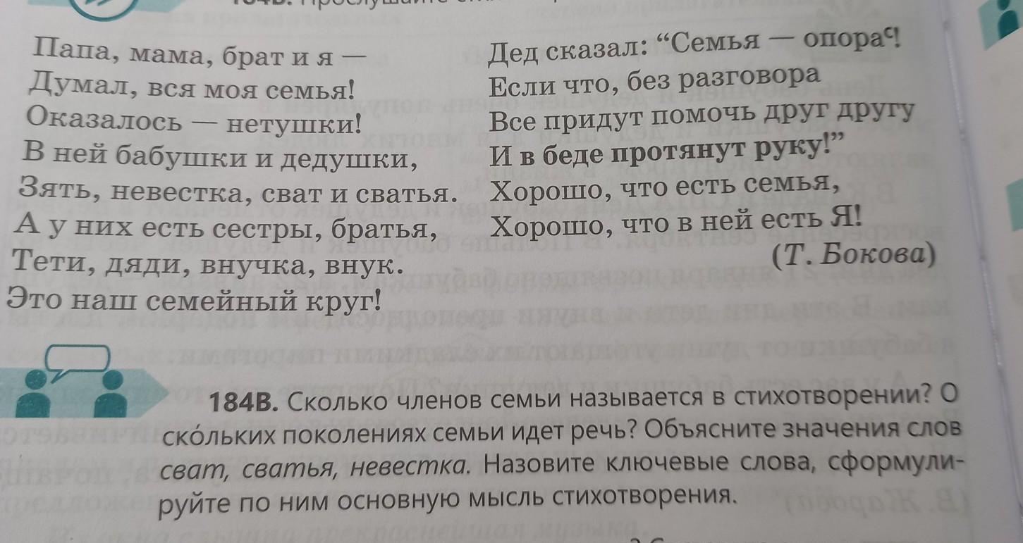 Сколько членов семьи называется в стихотворении? О скольких поколениях семьи идёт речь? Объясните значения слов сват, сватья, невестка. Назовите ключевые слова, сформулируйте по ним основную мысль стихотворения. :)))