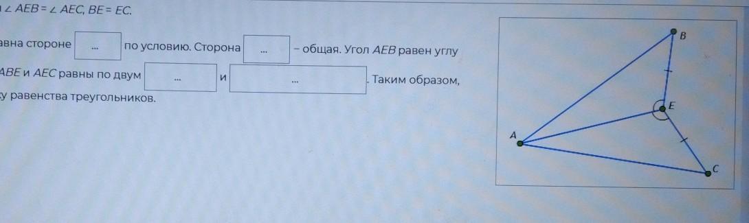 Рассмотрим треугольники ABE и АЕС. Сторона BE равна стороне ___ по условию. Сторона ___ — общая. Угол АЕВ равен углу ____ по условию. Следовательно, треугольники ABE и АЕС равны по двум ____ и ____ . Таким образом, треугольники ABE и АЕС равны по первому признаку равенства треугольников.