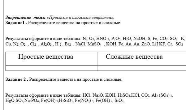 1 Простые: N2, O3, S, Fe, K, Cu, N2, O2, Cl2, H2, Br2, Fe, Au, Ag, Cr. Все остальные сложные.
