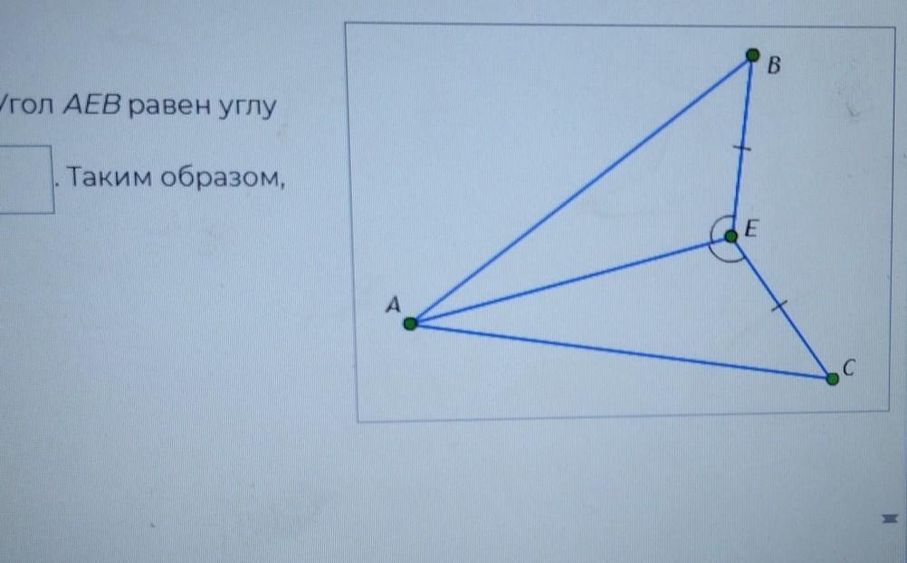 Докажите равенство треугольников АВЕ и АЕС, если угол AEB = угол AEC, BE = ЕС. Рассмотрим треугольники ABE и АЕС. Сторона BE равна стороне ___ (AB,AC,AE) по условию. Сторона ___ (AB, EC, AE) — общая. Угол АЕВ равен углу ____ (ABE,BAE,EAC) по условию. Следовательно, треугольники ABE и АЕС равны по двум ____ (углам, сторонам) и ____ (стороне между ними, углу между ними). Таким образом, треугольники ABE и АЕС равны по первому признаку равенства треугольников.