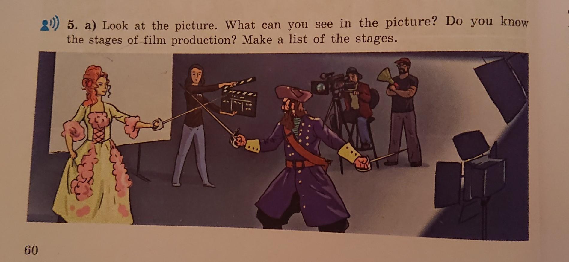 At this picture we can see a filming process, two actors: pirate, and lady, both them have a sabres, also we can see a producer with his assistant.I know six stages of film production: