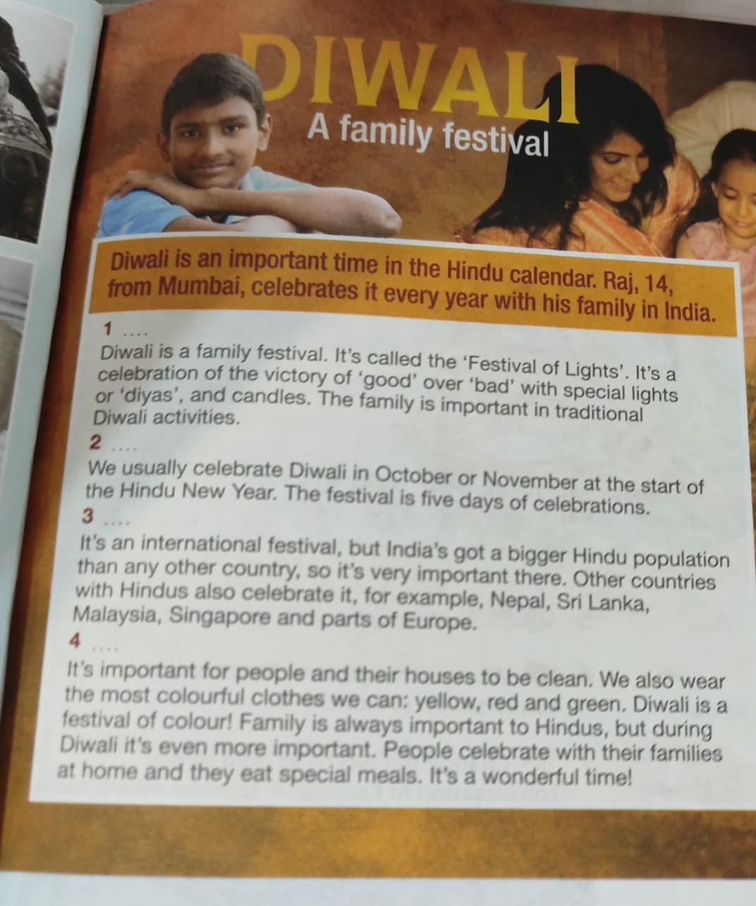 4 Read the text again. Choose the correct answers. 1 Diwal is a celebration of the family good. 2 Diyes are special lights I candles. 3 People celebrate for two months / five days during Diwali People all over the world / Only Indian people celebrate Diwal 5 Colourful dothes / houses are very important at Diwali time.