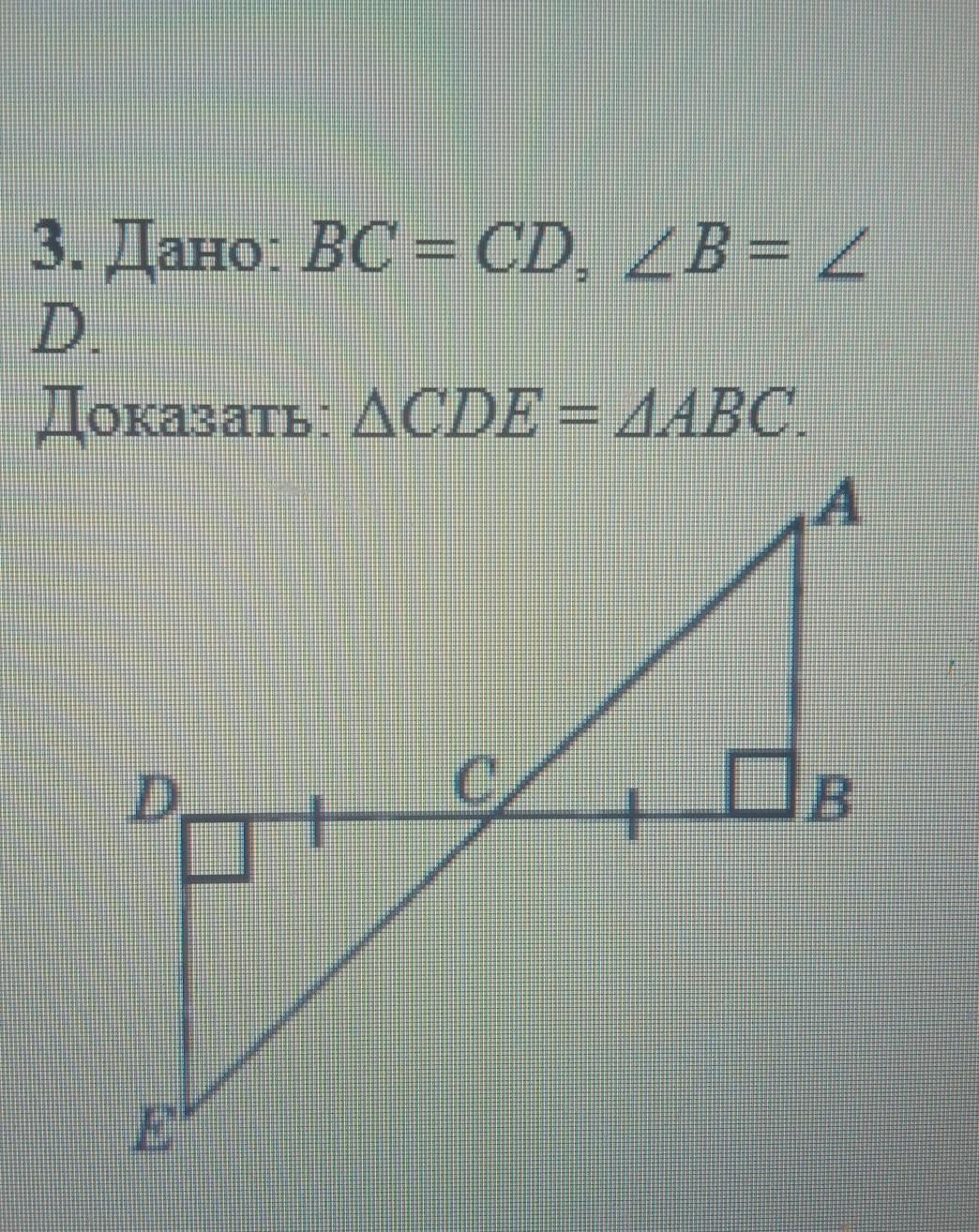 Рассмотрим треугольники, у них: BC=CD (как указано в задаче), /_B=/_D (как указано в задаче), а /_DCE=/_ACB потому что они вертикальные. Значит, за 2 признаком ровности треугольников ∆CDE =∆ABC
