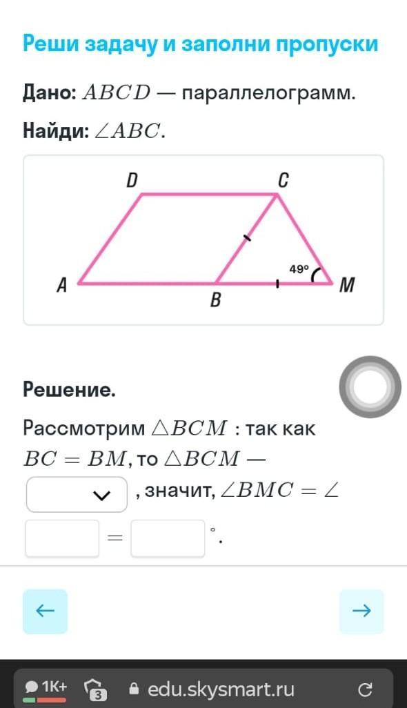 т.к. BC=BM, то треугBCM — равнобедренный, значит, <BMC=<BCM=49°
