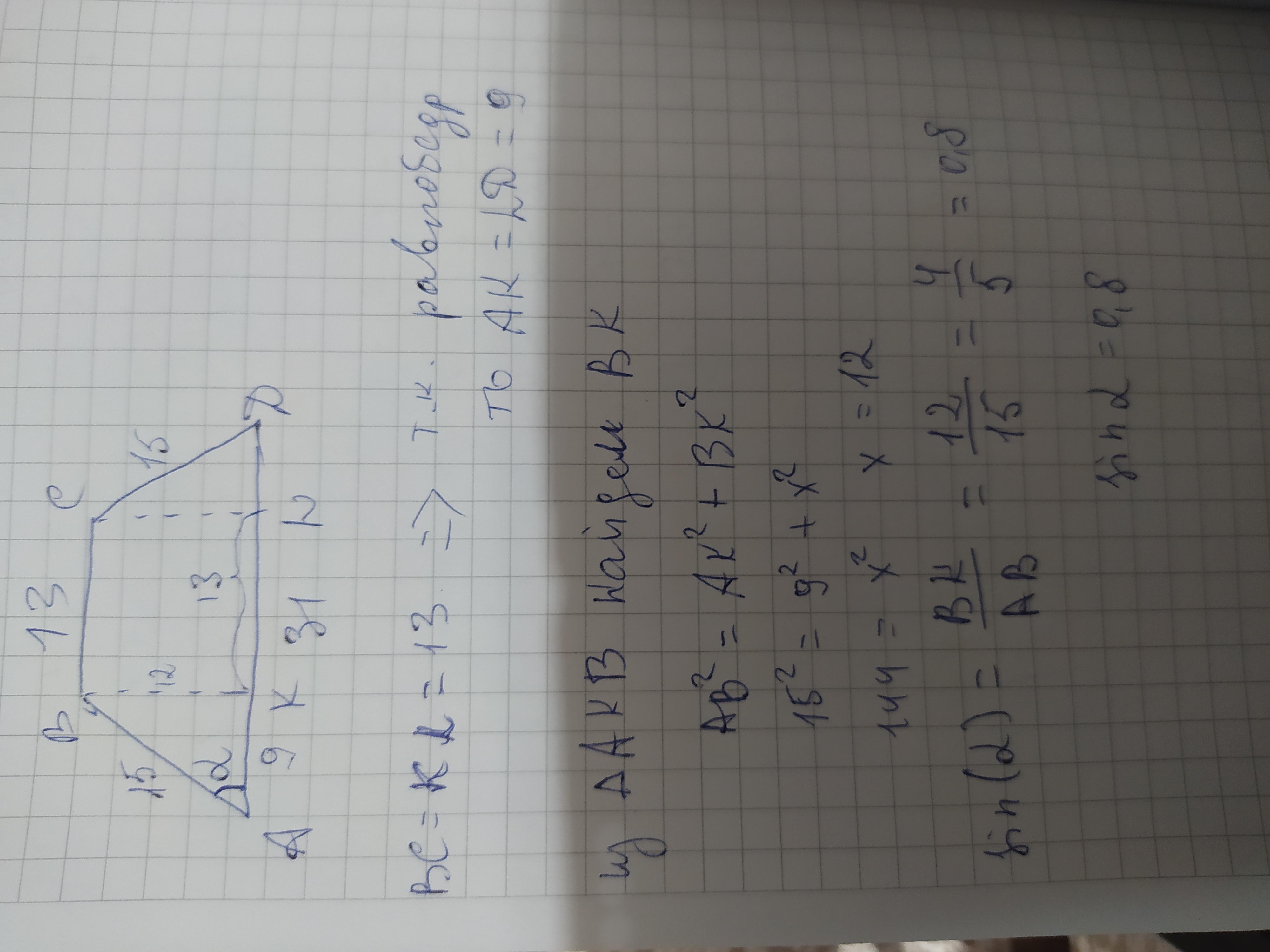 Основания равнобедренной трапеции равны 13 и 31. Боковые стороны равны 15. Найдите синус острого угла трапеции