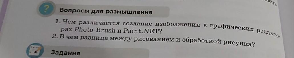 ? Вопросы для размышления 1. Чем различается создание изображения в графических редакто- рах Photo-Brush и Paint.NET? 2. В чем разница между рисованием и обработкой рисунка?