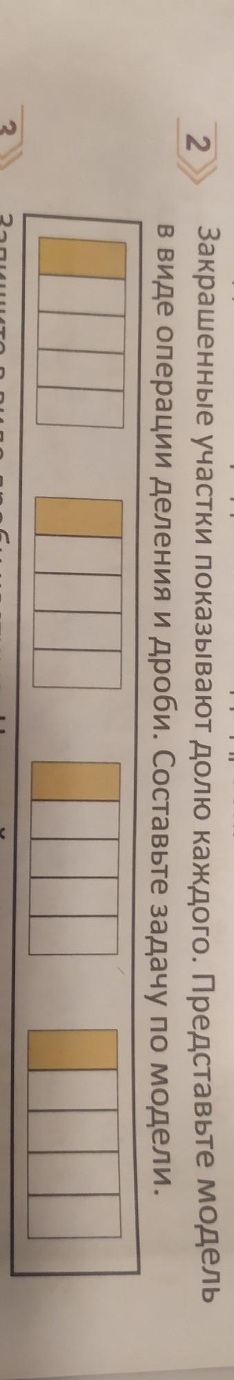 2 Закрашенные участки показывают долю каждого. Представьте модель в виде операции деления и дроби. Составьте задачу по модели.