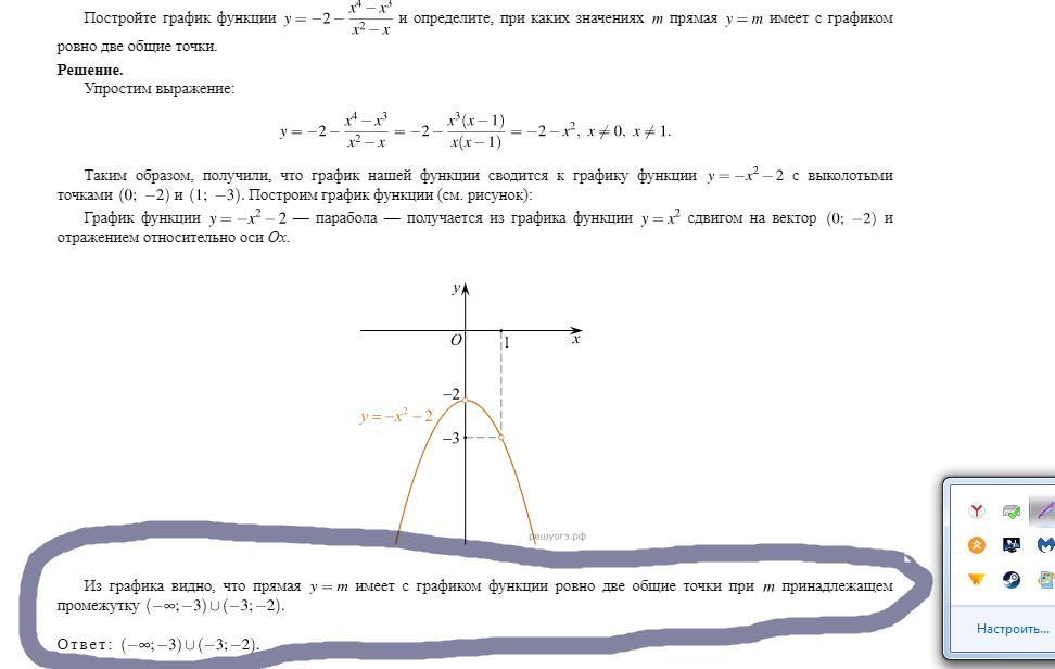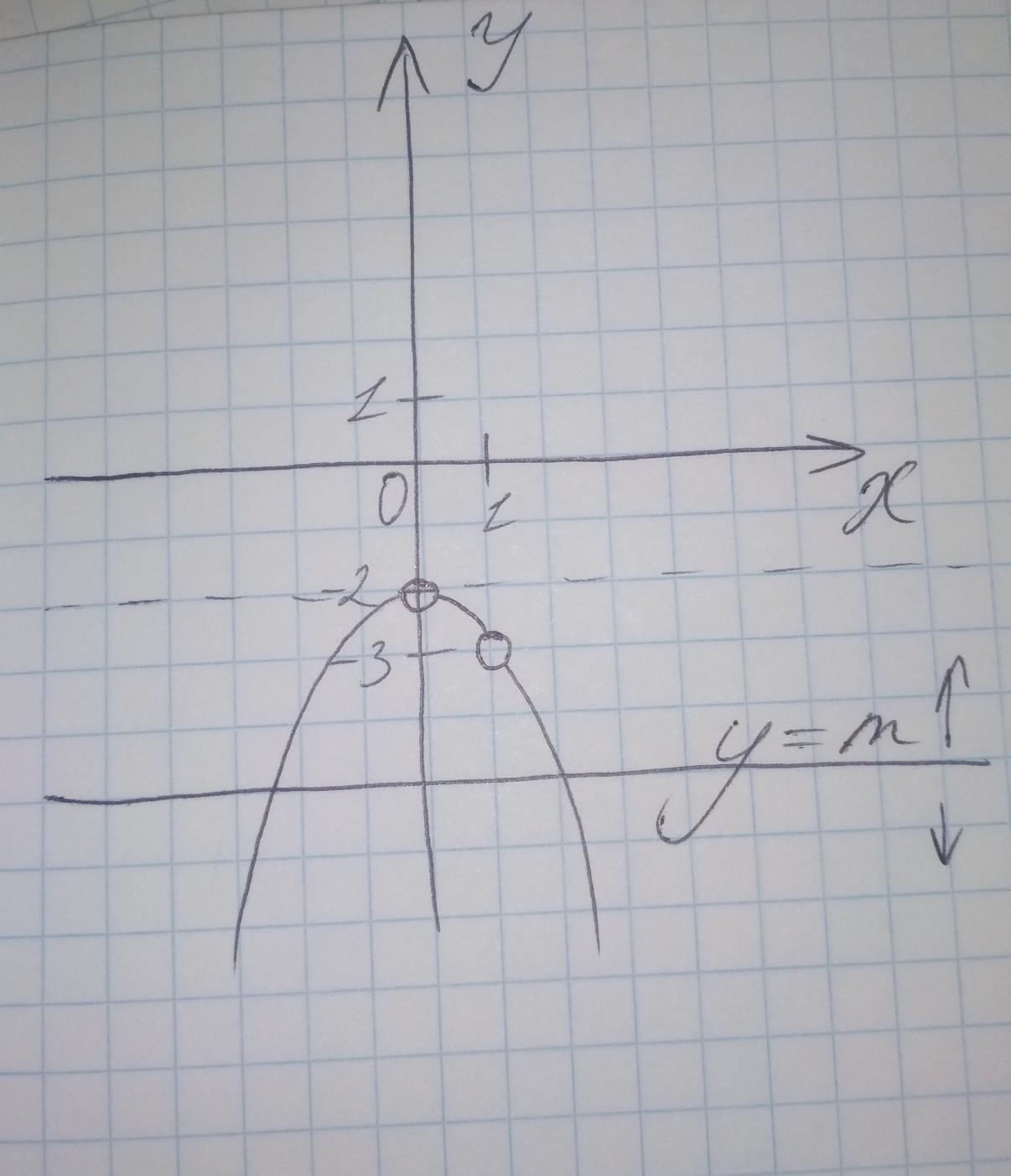 m є (-∞;-2), то прямая y=m будет иметь две общие точки с параболой. Но у нас есть виколотая точка х=1 и соответственно ей у=-3. Тоесть фунция в етих точках не существует, поетому значение -3 нам не подходит и нам нужно его так скажем выкинуть из промежутка. Мы имеем промежуток, который ми нашли