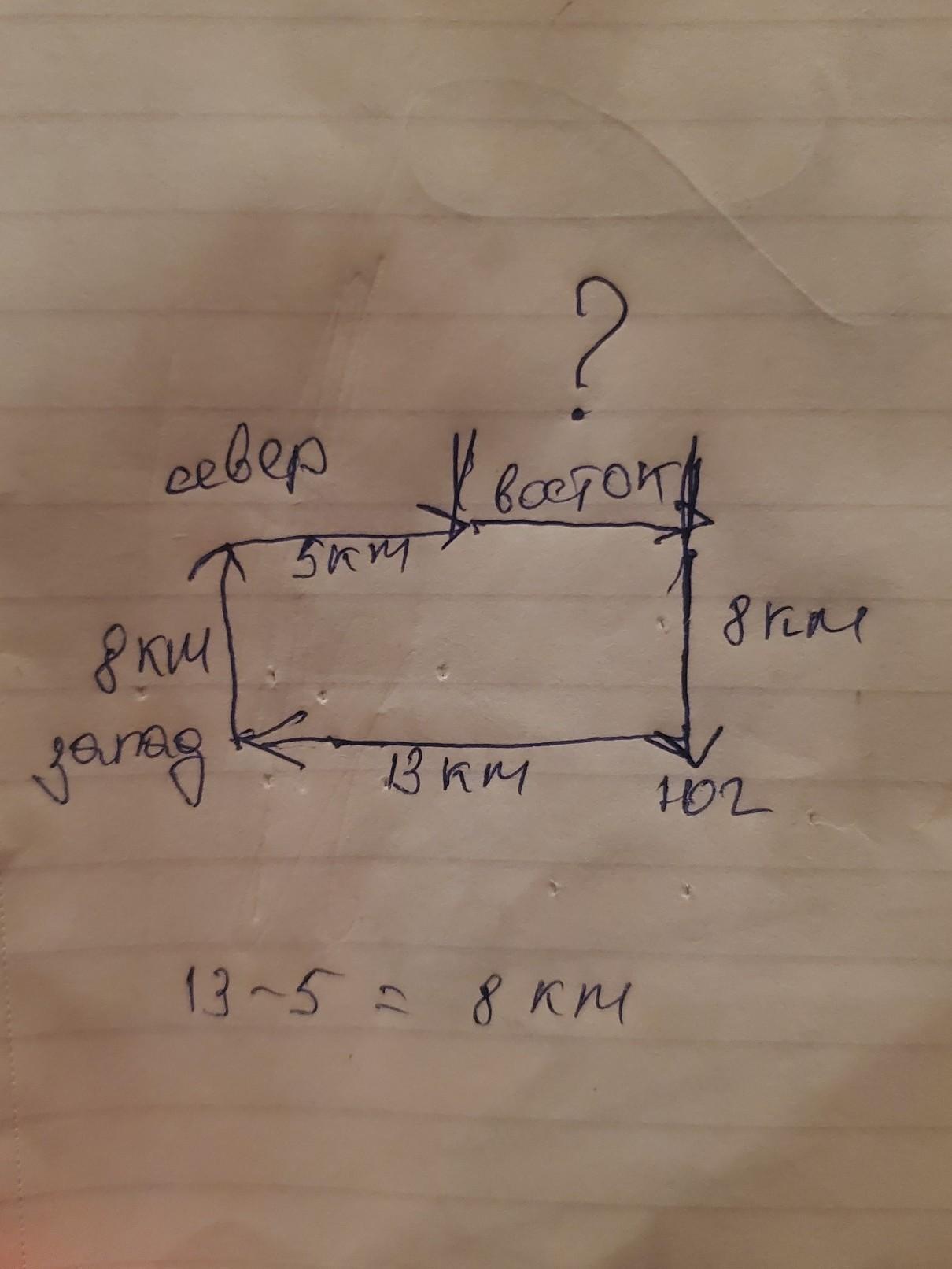 Турист в поисках объекта в незнакомой местности из точки A прошёл на юг 8 км, потом на запад 13 км, от достигнутой точки — на север 8 км и ещё 5 км на восток.