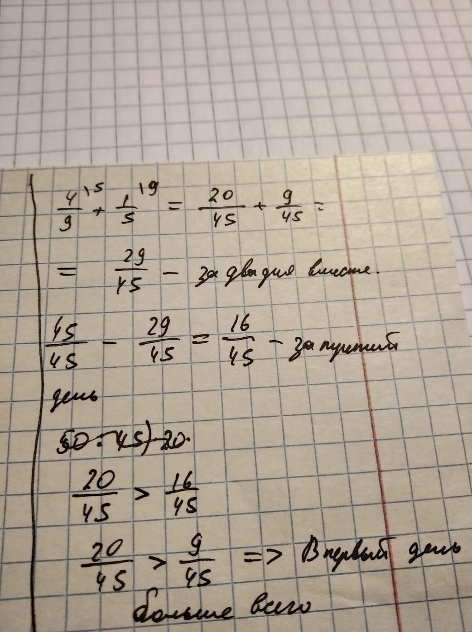 За первый день турист прошел - 4/9 туристического маршрута, за второй -1/5 маршрута, а за