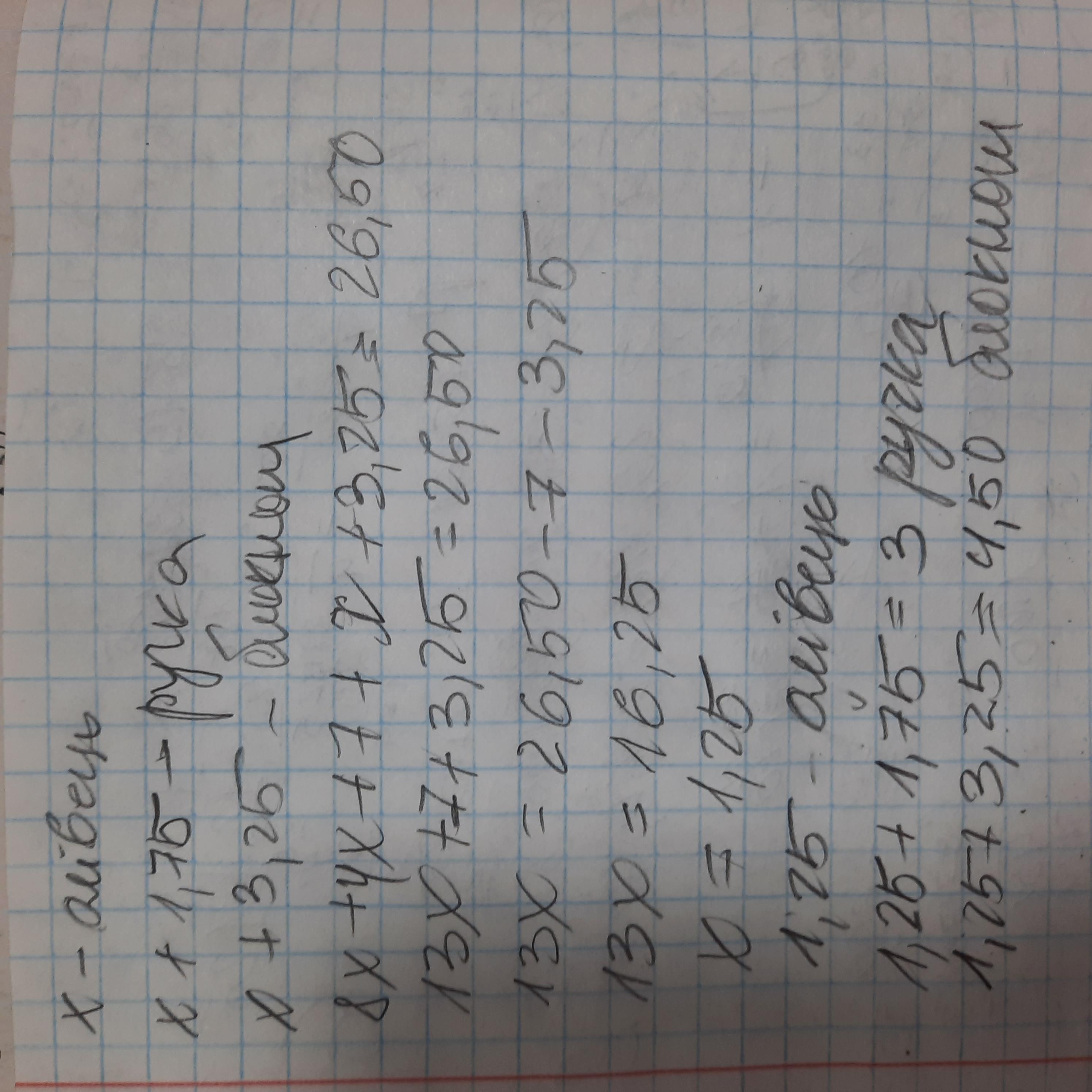 За 8 олівців, 4 ручки і блокнот заплатили 26 грн 50 коп. Олівець на 1 грн 75 коп. дешевший за ручку і на 3 грн 25 коп. дешевший за блокнот. Скільки коштують окремо олівець, руч- ка і блокнот?
