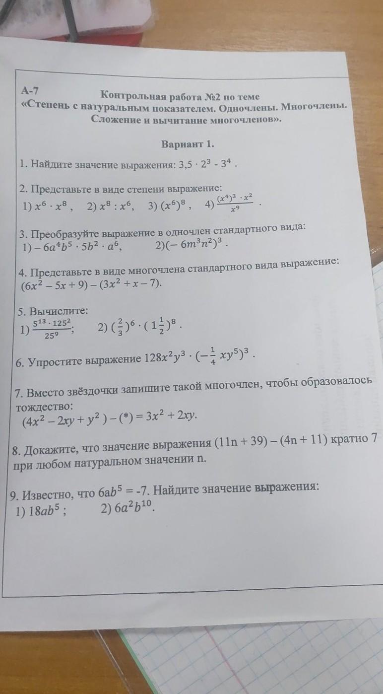 КР-2 «Степень с натуральным показателем. Одночлены. Многочлены. Сложение и вычитание многочленов» вариант 1