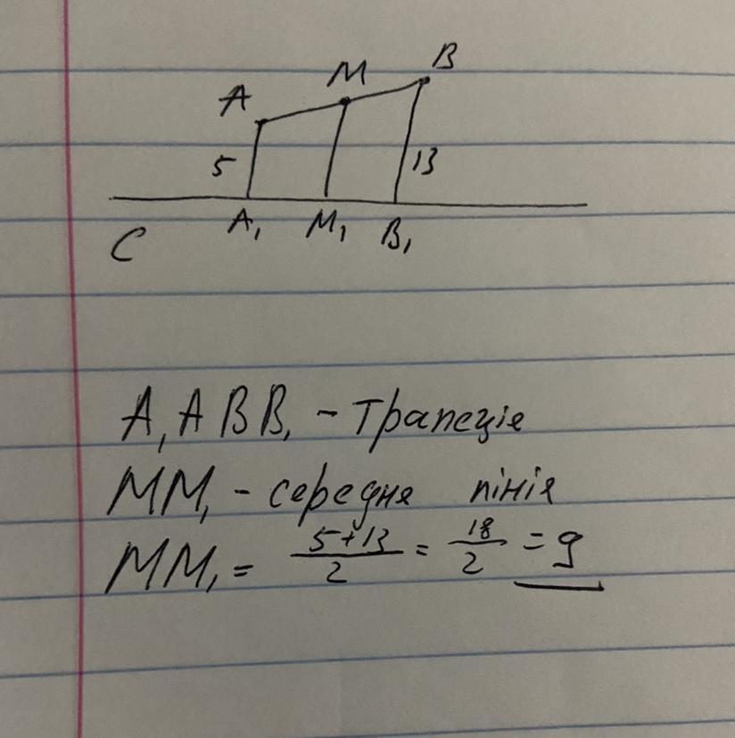 Отрезок AB не пересекает прямую c . Из его концов и середины M проведены перпендикуляры AA₁,MM₁,BB₁ к прямой c . Найдите MM₁,если AA₁=5, BB₁=13.