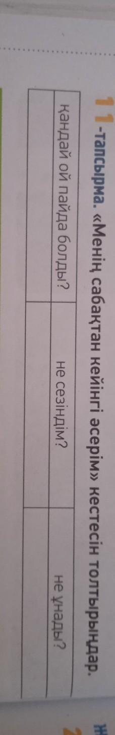 ЖАЗЫЛЫМ 11- тапсырма . «Менің сабақтан кейiнгi әсерім» кестесін толтырыңдар. қандай ой пайда болды ? не сезiндiм? не ұнады?