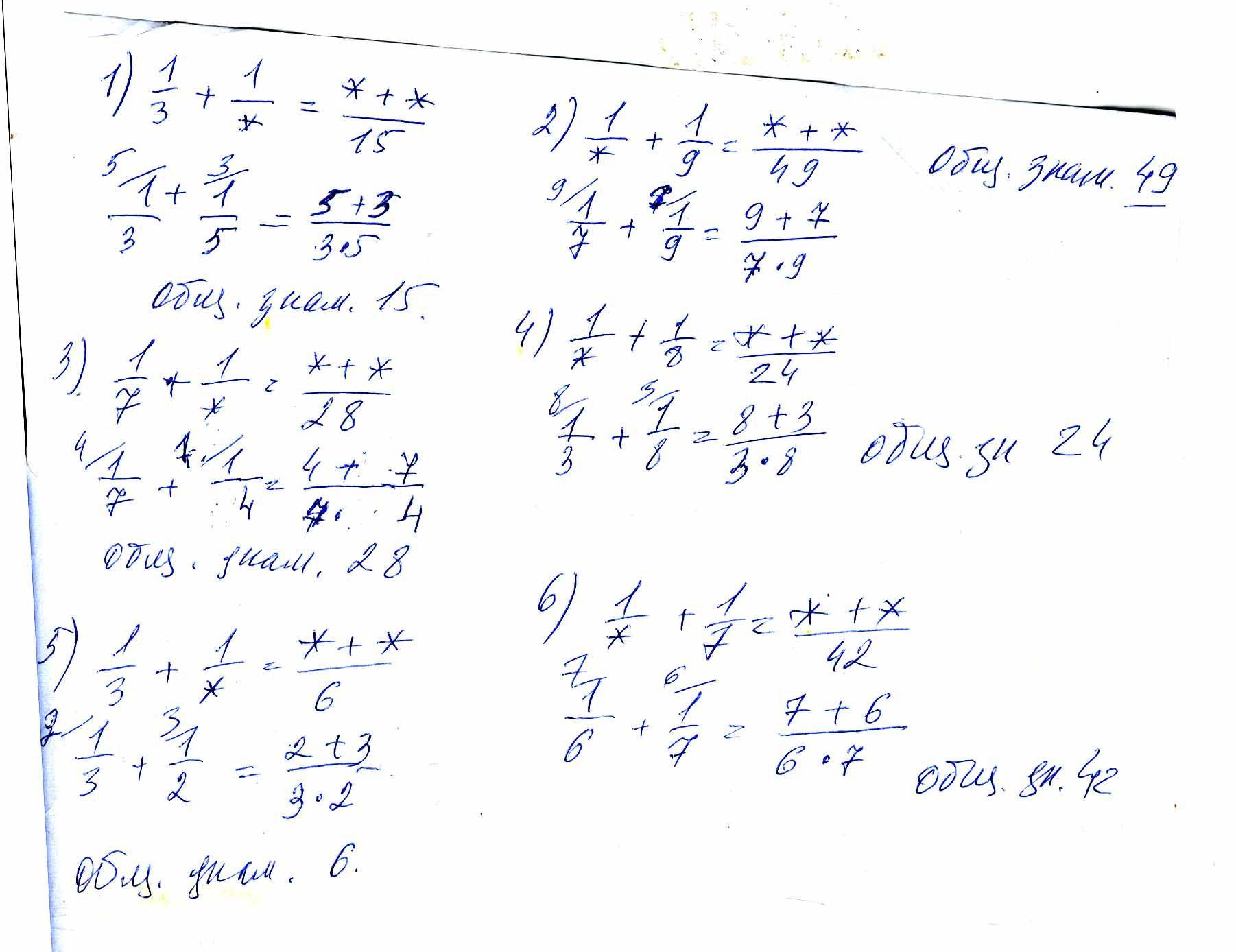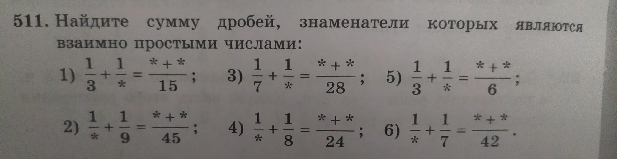 511. Найдите сумму дробей, знаменатели которых являются вааимно простыми числами: 1 * * * 1 1 + + + 1 1 4 1) . 3) 5) 3 15 7 8 6 5) 1 1 1 1 1 + 2) 6) 9 8 24 7