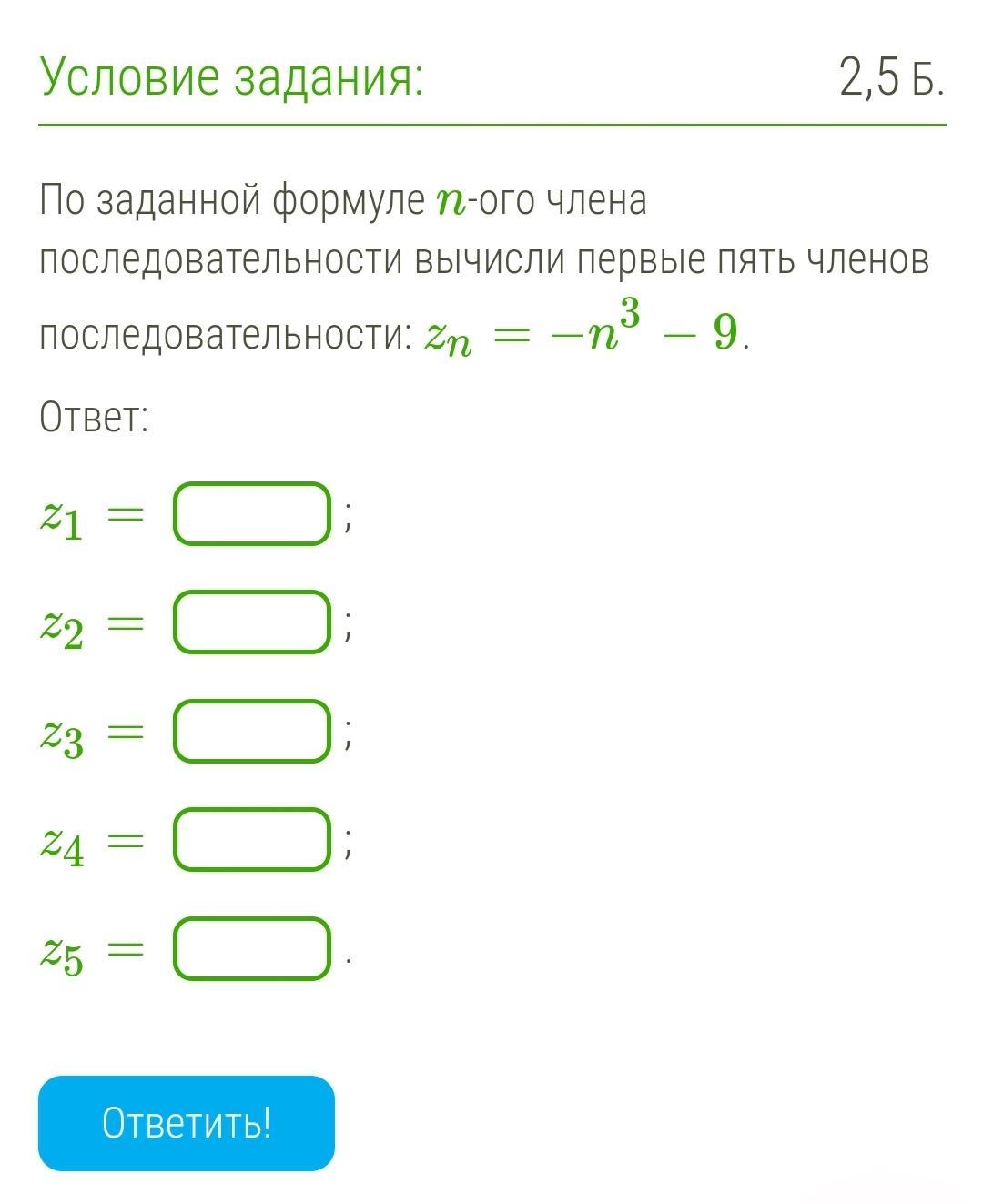 По заданной формуле n-ого члена последовательности вычисли первые пять членов последовательности: zn=−n³−9.