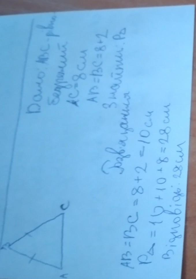 5. Знайдіть периметр рівнобедреного трикутника, основа якого дорівнює 8 см, а бічна сторона на 2 см більша за основу.