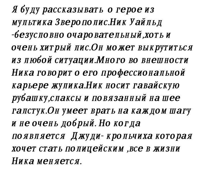 Я расскажу о герое из мультфильма «Зверь» от Fox. Ник Уайльд, конечно, обаятелен, ПО МЕНЯЮ И очень хитрый лис. Он может выйти из любой ситуации. Внешность Ника во многом говорит о его профессиональной карьере мошенника. На Нике гавайская рубашка, слаксы и завязанный на шее галстук. Он умеет лгать на каждом шагу и не очень добр. Но когда появляется кролик Джуди, которая хочет стать ученицей старшей школы, все в жизни Ника меняется.