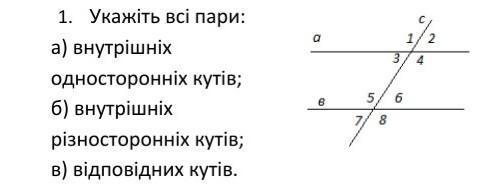 Укажіть всi пари: а) внутрiшнiх односторонніх кутів; б) внутрiшнiх рiзносторонніх кутів; в) відповідних кутів.